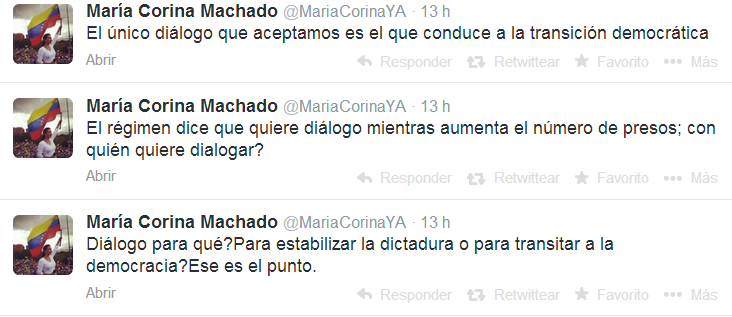 La oposición ya se reunió ayer con los cancilleres de Unasur a los que entregó una carta con una serie de condiciones para que se diera el diálogo, entre ellas que las conversaciones sean transmitidas por radio y televisión, que haya un tercero de «buena fe», así como que se amnistíe a los detenidos en las protestas que comenzaron el pasado día 12 de febrero.