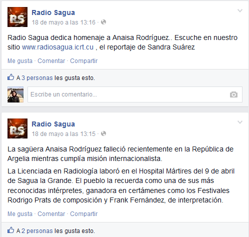 La sagüera Anaisa Rodríguez falleció recientemente en la República de Argelia mientras cumplía misión internacionalista, según la información divulgada en la página de facebook de Radio Sagua el 18 de mayo.