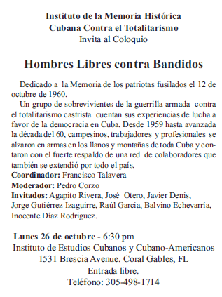 El coloquio de los sobrevivientes de la guerrilla armada contra los bandidos que llegaron al poder en Cuba e instauraron la dictadura más larga de América se realizará en la Casa Bacardi en la Universidad de Miami el lunes 26 de octubre alas 6.30 pm.