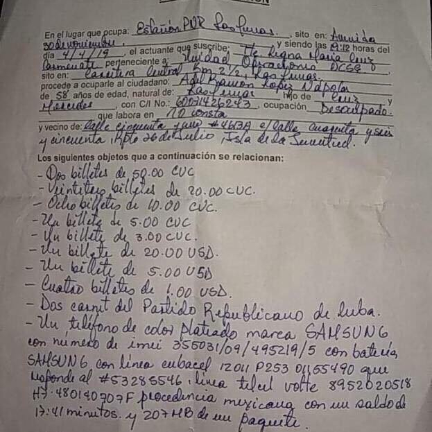 Según Leyva su esposo Adel, también integrante del PRC, fue detenido en Las Tunas el pasado día 4 de abril mientras realizaba labores propias del partido. En ese lugar le hicieron entrega de un acta de ocupación del dinero que llevaba consigo así como el teléfono celular.