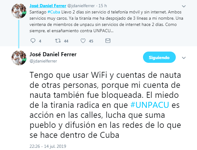 «Santiago #Cuba Llevo 2 días sin servicio d telefonía móvil y sin internet. Ambos servicios muy caros. Ya la tiranía me ha despojado de 3 líneas a mi nombre. Una veintena de miembros de UNPACU sin servicios de internet hace 2 días. Como siempre, el ensañamiento contra UNPACU… Tengo que usar WiFi y cuentas de nauta de otras personas, porque mi cuenta de nauta también fue bloqueada. El miedo de la tirania radica en que #UNPACU es acción en las calles, lucha que suma pueblo y difusión en las redes de lo que se hace dentro de Cuba.
