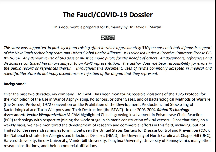 El periodista Rafael Palacios lo expuso en su cuenta «Aquí tenéis el dossier criminal del doctor Fauci. 200 páginas con todas las evidencias de que ha cometido Crímenes contra la Humanidad. Enumera violaciones / delitos, más de 5100 patentes relacionadas con el coronavirus y mucho más.