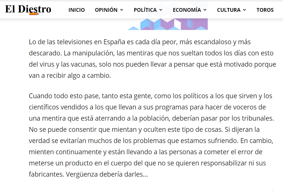 Volvemos a ver manipulación televisiva a raudales con la excusa del virus y las vacunas para hacer de voceros del gobierno y de esa forma, poder recibir una buena paguita a costa de los españoles. Lo que parecen no saber estos tramposos de las televisiones es que existen las redes sociales y sus fechorías cada vez son denunciadas por más personas, destacó hoy El Diestro.com.