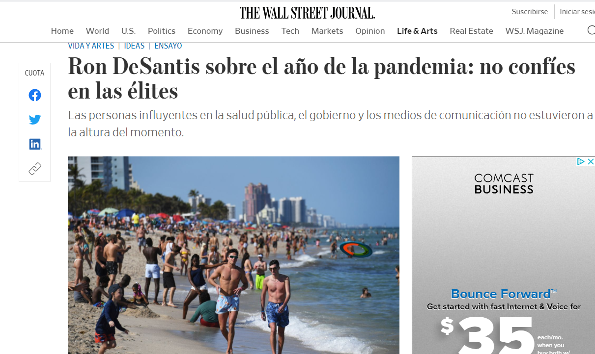 Un artículo publicado el pasado 18 de marzo por WSJ recoge la opinión del gobernador de la Florida Ron de Santis que debes conocer.