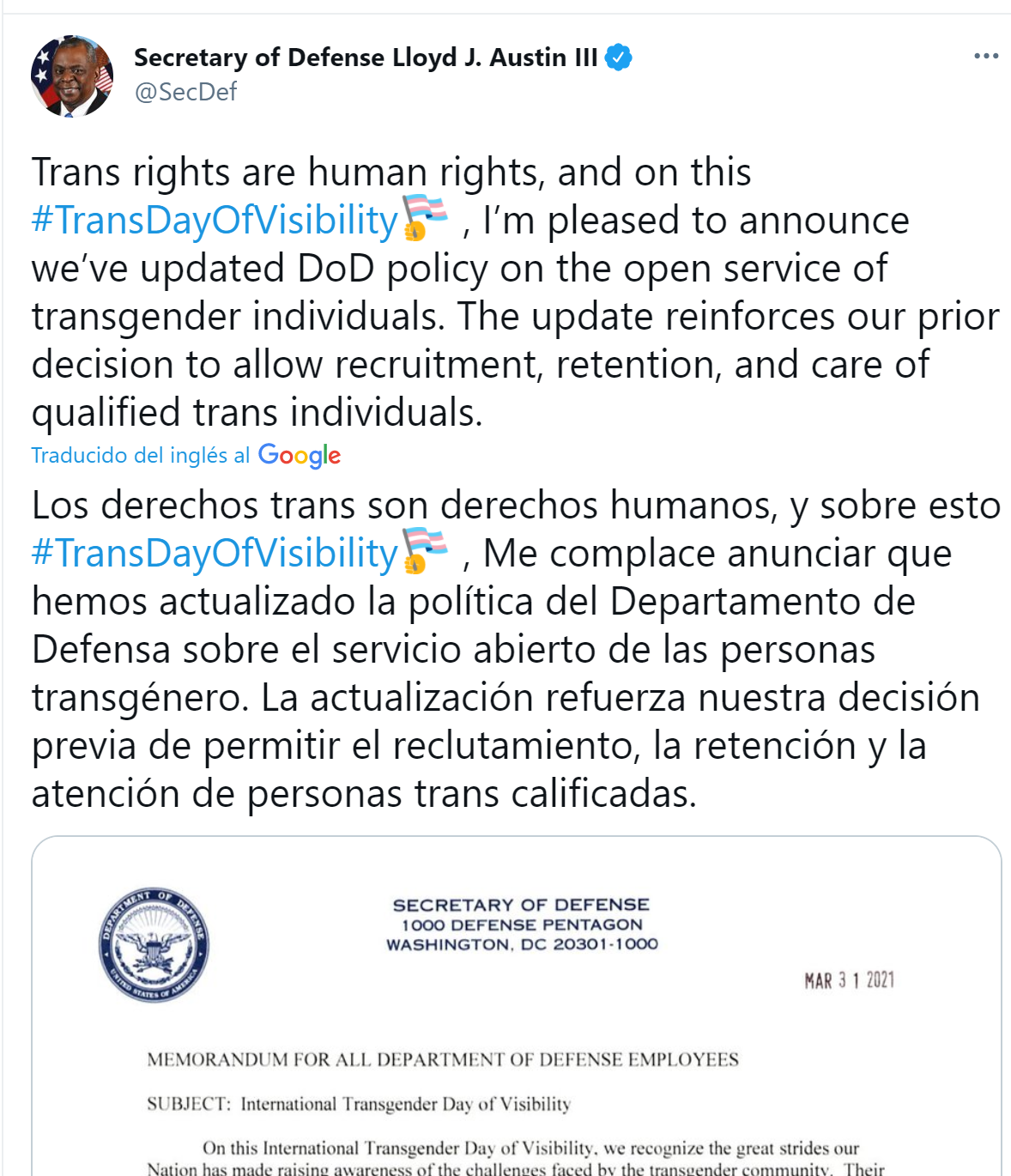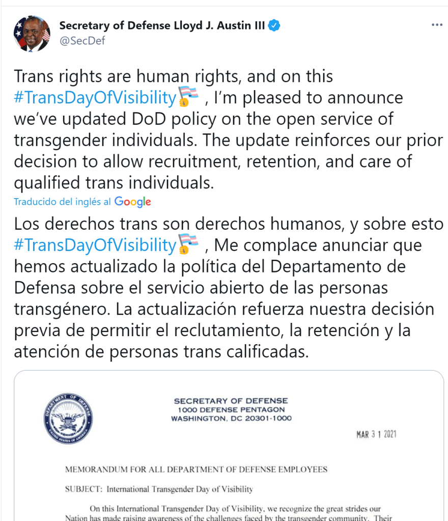 «Los derechos trans son derechos humanos, y sobre esto #TransDayOfVisibility , Me complace anunciar que hemos actualizado la política del Departamento de Defensa sobre el servicio abierto de las personas transgénero. La actualización refuerza nuestra decisión previa de permitir el reclutamiento, la retención y la atención de personas trans calificadas», expresó el Secretario de Defensa.