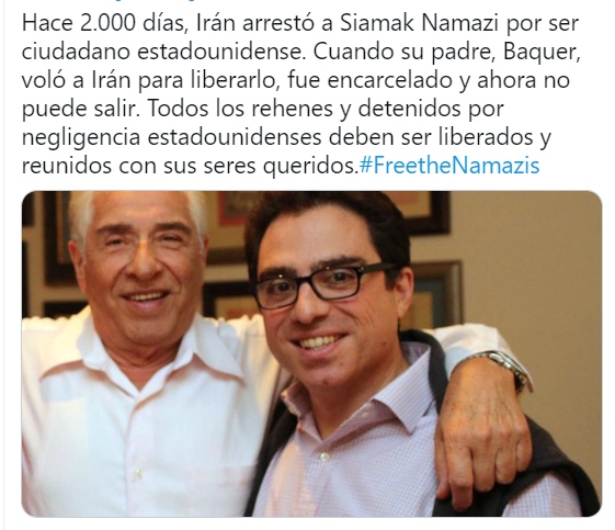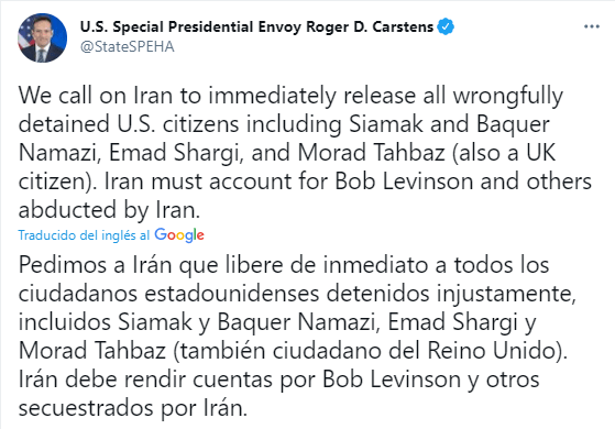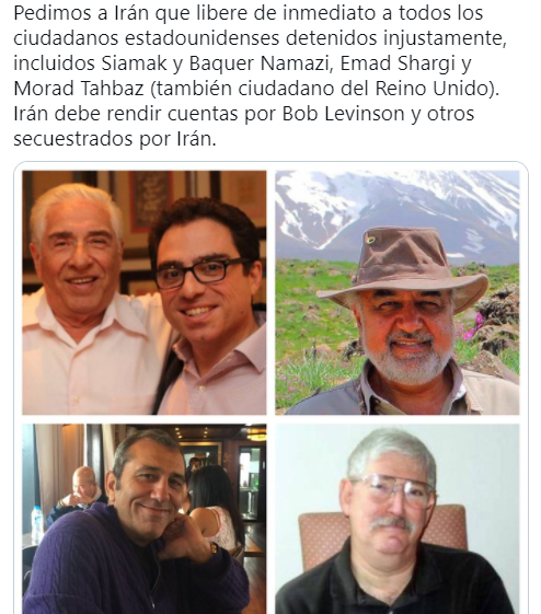 Pedimos a Irán que libere de inmediato a todos los ciudadanos estadounidenses detenidos injustamente, incluidos Siamak y Baquer Namazi, Emad Shargi y Morad Tahbaz (también ciudadano del Reino Unido).