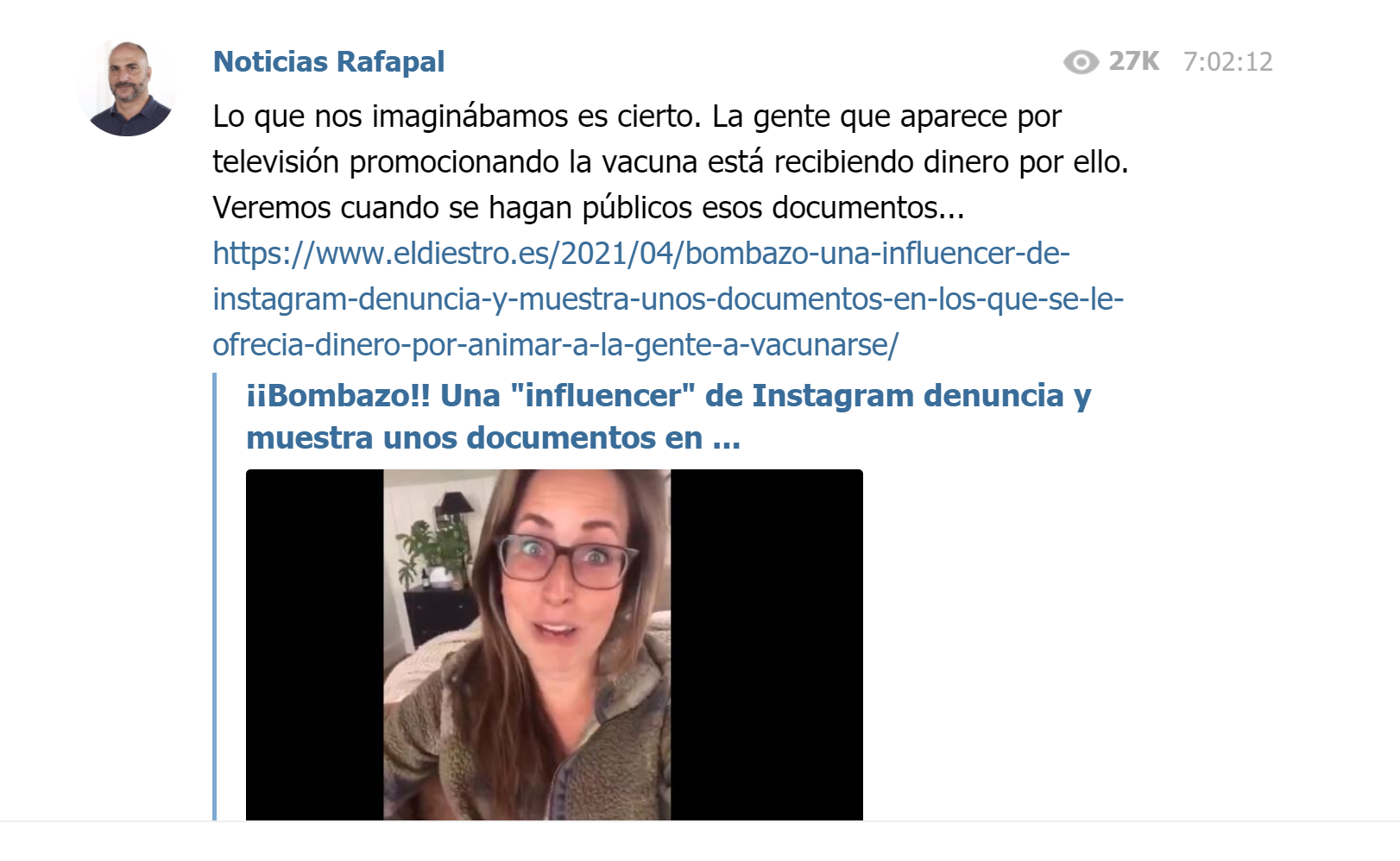 Telegram y ElDiestro.es ¡¡Bombazo!! Una “influencer” de Instagram denuncia y muestra unos documentos en los que se le ofrecía dinero por animar a la gente a vacunarse