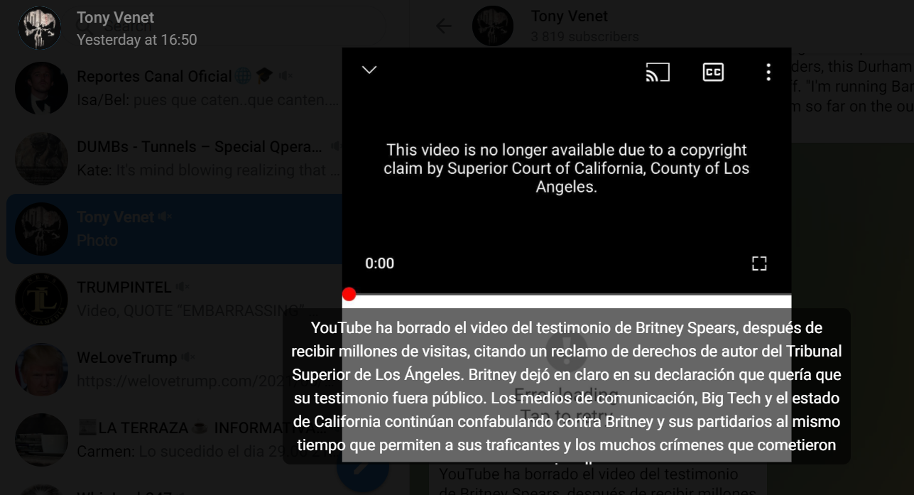 YouTube ha borrado el video del testimonio de Britney Spears, después de recibir millones de visitas, citando un reclamo de derechos de autor del Tribunal Superior de Los Ángeles. Britney dejó en claro en su declaración que quería que su testimonio fuera público. Los medios de comunicación, Big Tech y el estado de California continúan confabulando contra Britney y sus partidarios al mismo tiempo que permiten a sus traficantes y los muchos crímenes que cometieron contra ella.