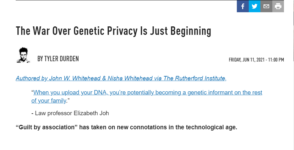 Tu ADN, usos y abusos. Un artículo que debe leerse con detenimiento. https://www.zerohedge.com/medical/war-over-genetic-privacy-just-beginning?s=09