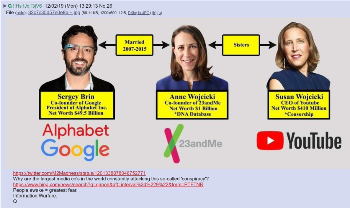 Abajo una foto que ayuda a entender mejor hasta donde nos han «cogido» Resulta que el cofundador de Alphabet (Google) estuvo en vinculo con la co-fundadora de 23 and me que es hermanita de la CEO de Youtube.