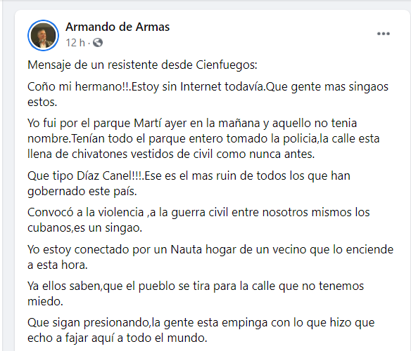Esto me tiene el alma rota hermano, resulta que los cubanos de afuera que tanto criticaron ellos ,se portaron muchísimo mejor que todos ellos. Era preferible que el domingo hubiese hablado el Cardenal pidiendo concordia que no este singao. Me estoy quedando sin carga, siéntete orgulloso de ser un hijo de Cienfuegos y de seguir haciendo todo lo que haz hecho y haces para que tu patria cambie mi hermano, el abrazo para ti y todos tus amigos, sigan presionando coño, esto tiene que volver a ser lo que fue.