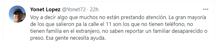 Diario de navegante, Letras, Arte, PublicacionesSin palabras: «la mayoría de los que salieron pa la calle el 11 son los que no tienen… Comparte esto:Tweet Compartir en Telegram (Se abre en una ventana nueva) Telegram Compartir en WhatsApp (Se abre en una ventana nueva) WhatsApp Me gusta Cargando...