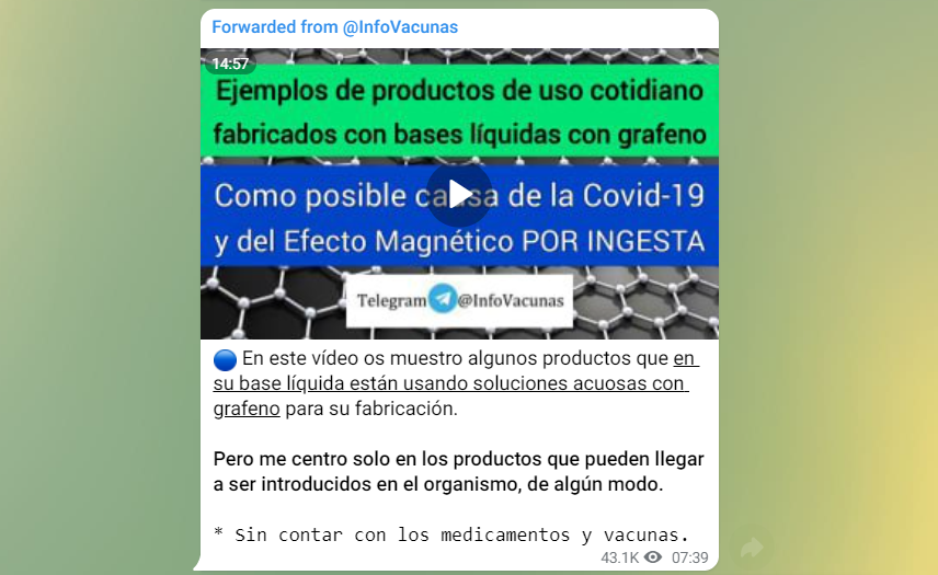 El grafeno está en todas partes. Así se titula un video divulgado en Telegram por @infovacunas. Si usted tiene cuenta en esa red alternativa búsquelo por si quiere escucharlo en el sitio original.