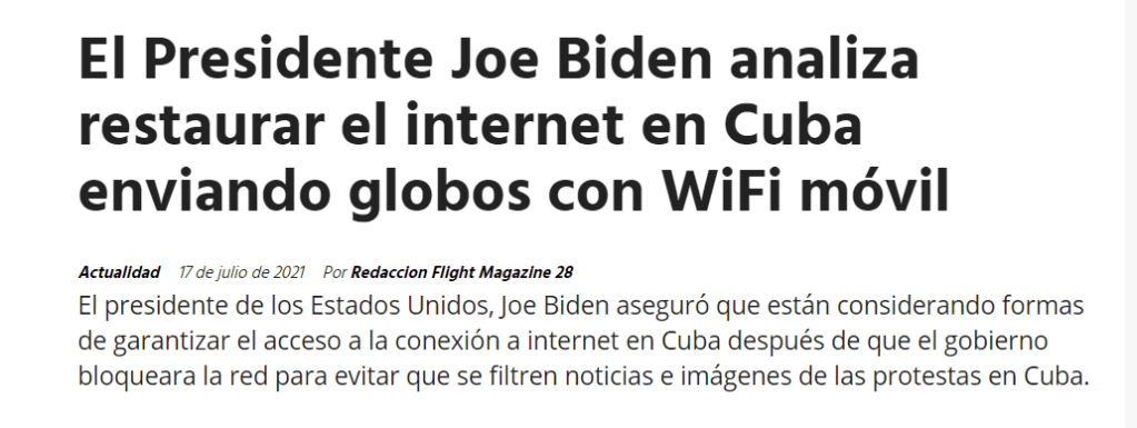 Otros sitios sobre el tema: ( 17 de julio): https://flightmagazine28.com.ar/contenido/821/el-presidente-joe-biden-analiza-restaurar-el-internet-en-cuba-enviando-globos-co