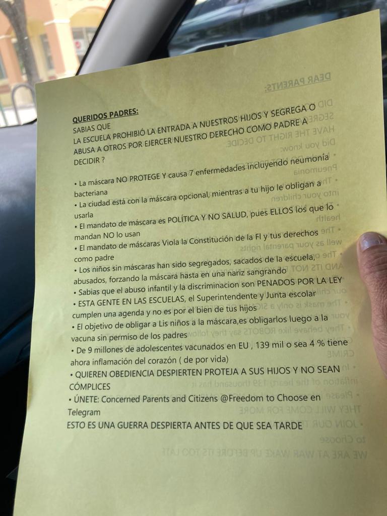 Junto a Hugo Sánchez una maestra, una enfermera y padres estuvieron en la tarde de ayer realizando gestiones para entregar a los que fueron a recoger a sus hijos en una escuela del Sur de Miami Dade una serie de flyer explicándoles cuántos derechos y libertades se violan cuando aplican un mandato del superintendente que por demás afecta el bienestar de los niños.