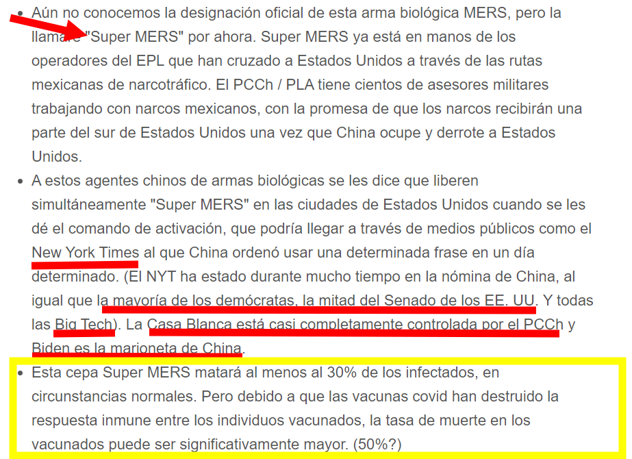 “Ahora sabemos por otras fuentes que los equipos de despliegue de armas biológicas dirigidos por el PCCh han cruzado la frontera de los EE. UU., Portando armas biológicas aumentadas por MERS con una tasa de mortalidad de al menos un 30%, con planes para liberarlas en las principales ciudades de EE. UU. cuando se les ordene”.