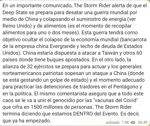 TheStormRider: CABLES> China se está preparando para la GUERRA. << Fuentes INTERIORES dicen que China sabe que se acerca el momento INMINENTE cuando el MILITAR de EE. UU Responderán contra el ATAQUE DE BIOWEAPON COVID-19 << (dentro del PENTÁGONO Top GENERALS están esperando el momento perfecto para HACER … Arresten a los SPIES traidores [DS] en sus filas militares) y el gobierno.// China está posicionando actualmente a través del MUNDO sus buques de guerra MILITARES en más de 60 países y planea tomar Taiwán pronto. > El esfuerzo de Biden para debilitar a los soldados militares mediante la aplicación de las vacunas, a sabiendas de que los soldados y los militares se dividirán y será un momento perfecto para que China HAGA y cause el caos a través de / DETENCIÓN DEL ENVÍO. CRISIS ENERGÉTICAS ../ SUMINISTROS ESENCIALES . Todos los MILITARES están en alerta alta >>> ____________________________ Sólo hay una oportunidad para que todas las ALIANZAS MILITARES HAGAN UN GOLPE en sus propios gobiernos estatales profundos y [DS] EL PCCh MILITAR SABE QUE ESTE MOMENTO ESTÁ LLEGANDO << DENTRO DE CHINA ESTÁ SUCEDIENDO UN GOLPE SILENCIOSO TAMBIÉN … TODOS LOS PAÍSES ESTÁN ALTA ALTA. … >> INVIERNO OSCURO << ____________________________Muchos de ustedes no lo saben … 1.4 mil millones de humanos morirán por las vacunas (ataque de armas biológicas) y el caos de los recuentos de muertes ya ha comenzado /// Estos importantes movimientos de ajedrez tenían que suceder … White HATS dio un paso atrás como enemigo agotó sus movimientos finales y energía ….. Entonces SUCEDE LA HUELGA << LA NOTICIA ES FALSA LA GUERRA ES REAL / ______________________________ cuando digo [FALSA] GUERRA … quiero decir que el ESTADO PROFUNDO está planeando estas GUERRAS en todo el mundo para confusión .. Hacer que las ovejas aparten la mirada de la Verdad de [EXPOSICIÓN] del Plandemic. Las vacunas de armas biológicas … Esta GUERRA [FALSA] no es menos una GUERRA … Pero los MILITARES DE LOS SOMBREROS BLANCOS intervendrán antes de que el GRAN conflicto nuclear estalle en un holocausto <<<< ____________________________Siempre es importante tener listos tus 30_60 días de comida, agua y suministros. Sentido común < ____________________________ [CRASH] Estás dentro de este_EVENTO CERCA DE LA MUERTE EVENTO DE CIVILIZACIÓN TU DENTRO DE ESTE EVENTO … ____________________________ DENTRO DE LA TORMENTA ____________________________ DOLOR