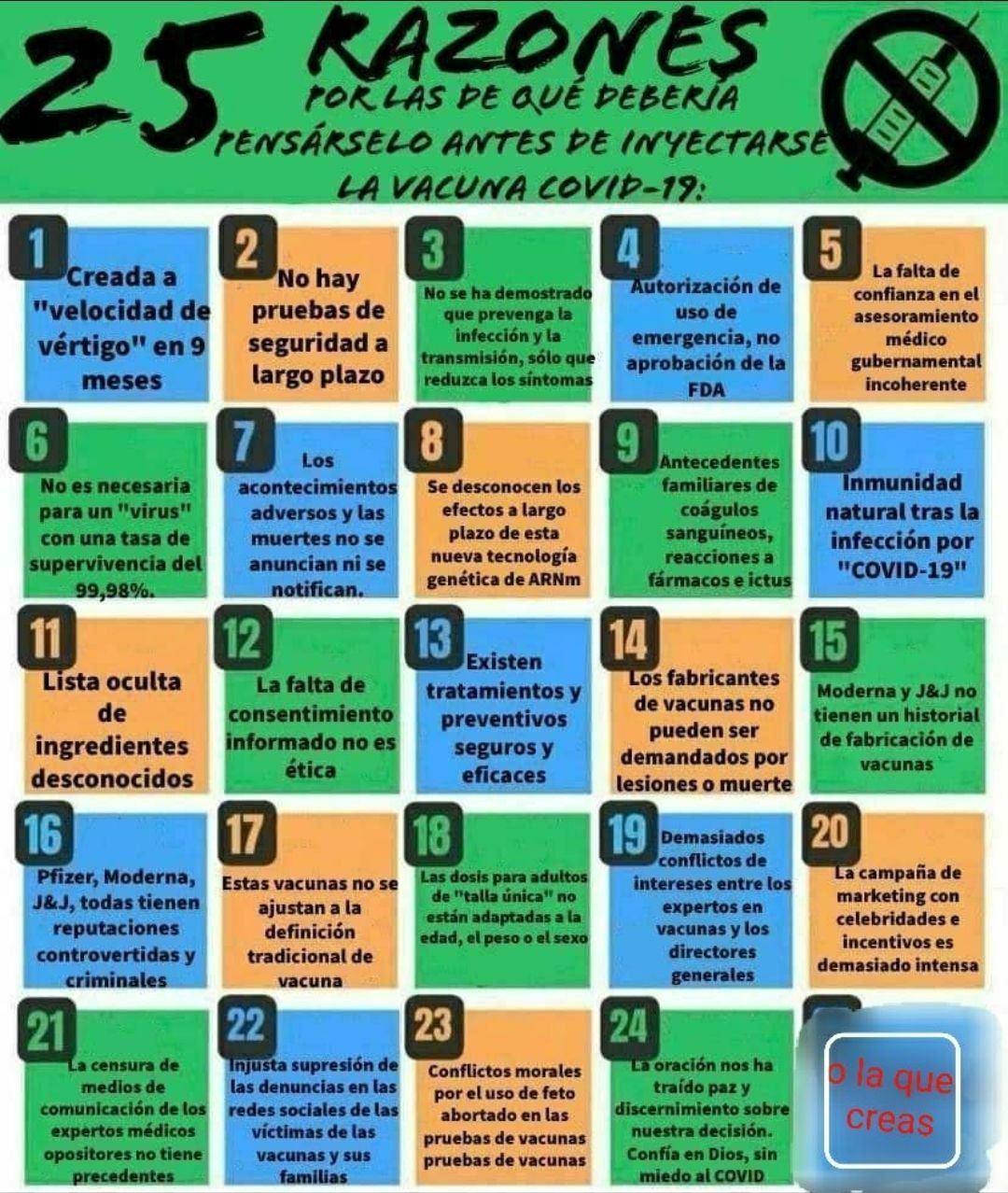 25 razones por las cuáles deberías pensarte antes de inyectarte la vacuna contra covid-19(obviamente hay más razonas, pero estas son las principales)
