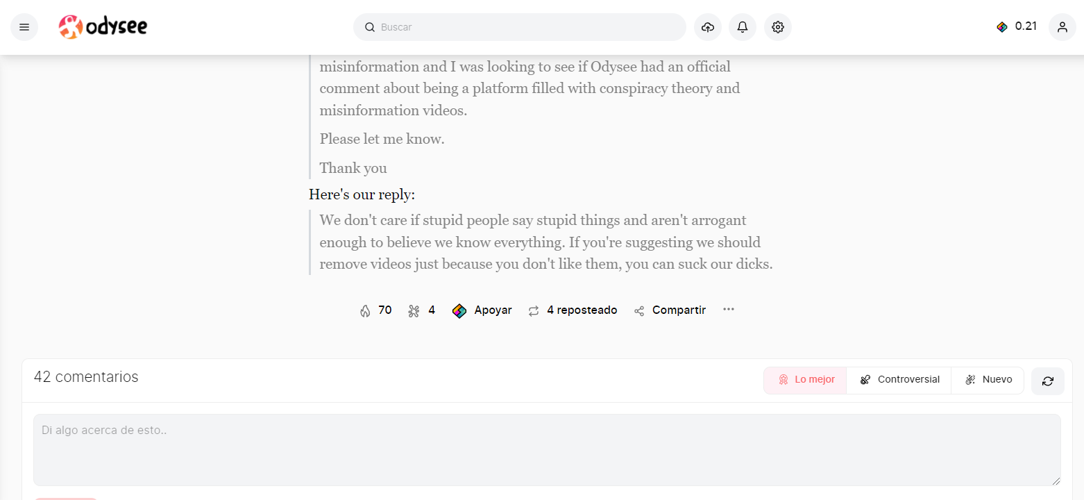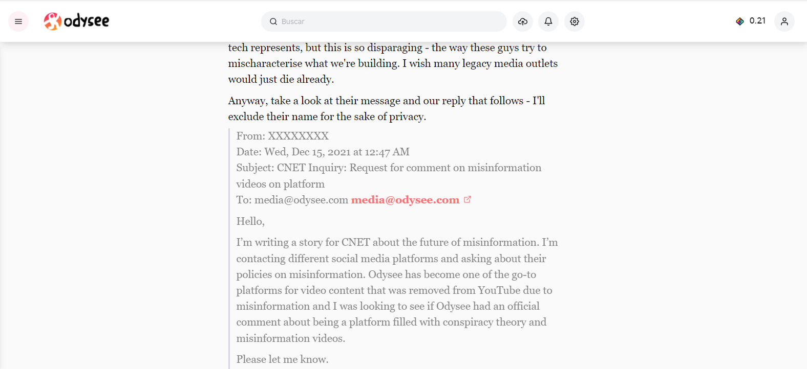 Este 17 de diciembre cuando fui censurada (12 horas después de la emisión en vivo) con el argumento que siempre usan en mi caso desinformación médica revisé mi canal de Odysee que hacía días no miraba (yo confiada en que mis videos se estaban compartiendo automáticamente) y comprobé que desde julio hasta la fecha han sido muy pocos los videos que han corrido con buena suerte y se han alojado en Odysee.