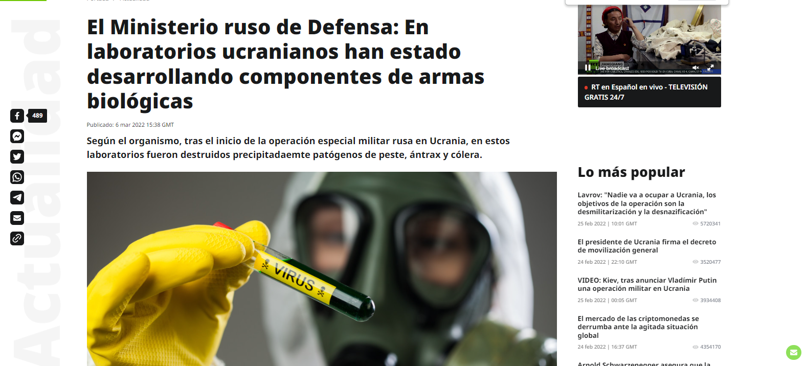 En RusiaToday: «En laboratorios ucranianos situados cerca del territorio de Rusia se han venido desarrollando componentes de armas biológicas, informó este domingo el portavoz del Ministerio de Defensa de Rusia, Ígor Konashénkov«.