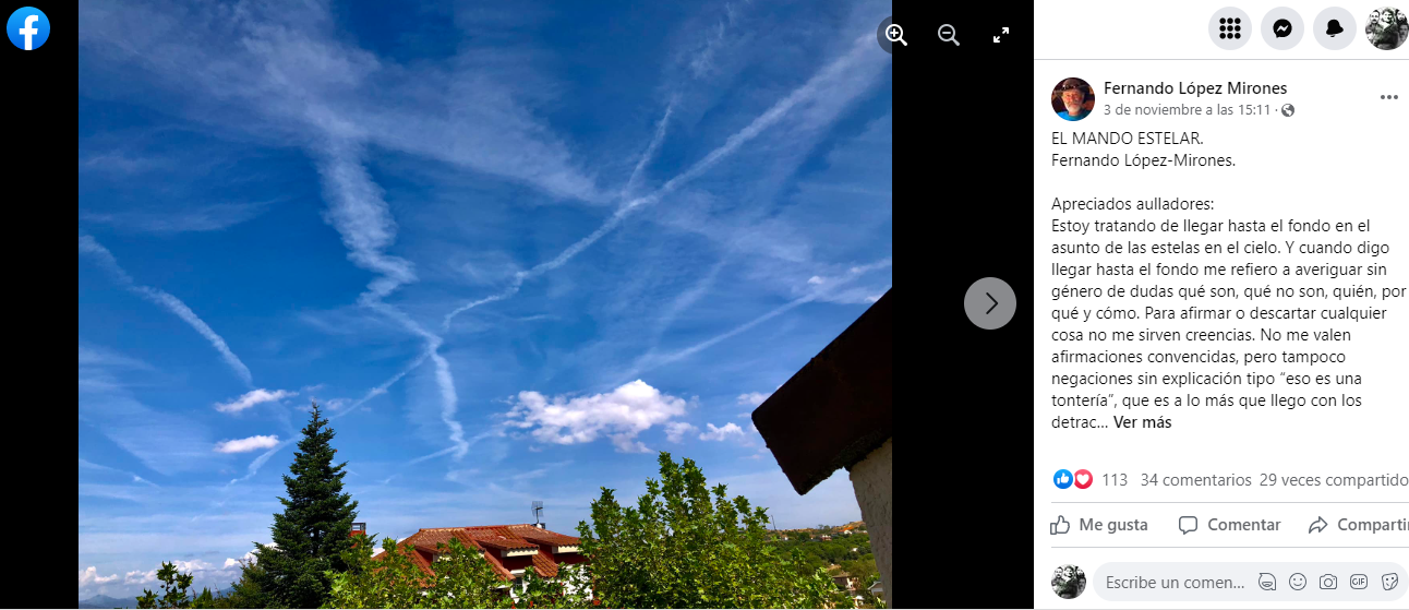 Estoy tratando de llegar hasta el fondo en el asunto de las estelas en el cielo escribió Fernando Lopez Mirones, español que en sus redes sociales se presenta como biólogo, divulgador Científico, Director y guionista de CINE documental y Profesor Univ Complutense.
