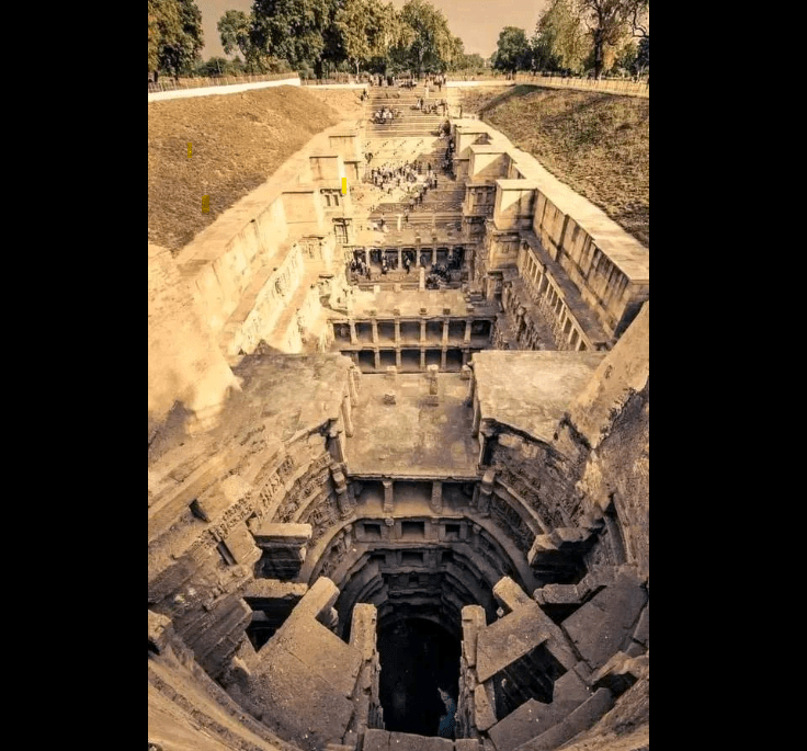 Rani-ki-Vav, a orillas del río Saraswati, fue construido inicialmente como monumento a un rey en el siglo XI d. C. Los pozos escalonados son una forma distintiva de sistema de almacenamiento y almacenamiento de agua subterránea en el subcontinente indio, y se han construido desde el tercer milenio a. C. Evolucionaron con el tiempo desde lo que era básicamente un pozo en suelo arenoso hasta elaboradas obras de arte y arquitectura de varios pisos.