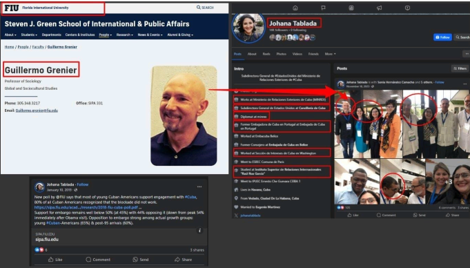 La relación del profesor Guillermo J. Grenier, de la Universidad Internacional de Florida (FIU), con Johana Tablada, Subdirectora General de la Dirección General para los Estados Unidos en el Ministerio de Relaciones Exteriores (MINREX), queda evidenciada en una publicación de Facebook en la que Tablada promociona públicamente la Encuesta Cubana (Cuba Poll), realizada por Grenier en el Instituto de Investigaciones Cubanas de la FIU.