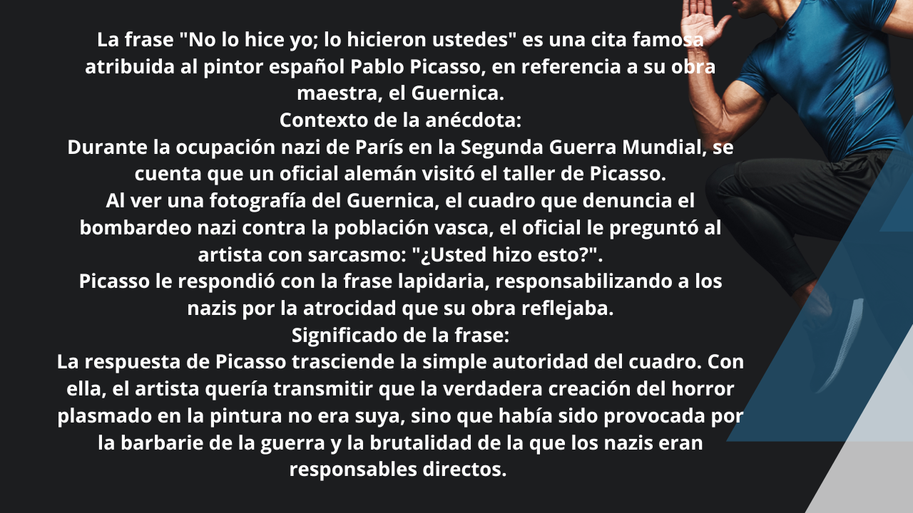 No lo hice yo; lo hicieron ustedes. Es una cita famosa atribuida al pintor español Pablo Picasso, en referencia a su obra maestra, el Guernica.